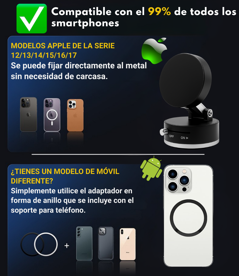 Los soportes MagAxis son compatibles con cualquier smartphone que tenga tecnología MagSafe o funda magnética. También puedes usarlo con móviles que no tengan MagSafe si colocas el aro metálico adhesivo que incluimos.